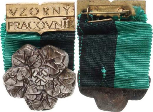Odznak "Vzorný pracovník podniku" Za dlouholetou práci v hornictv í uděluje Důl 1. máj postř bronz 32,5x28,5 mm stužka s kovov ým štítkem +průkaz držitele orig. etue