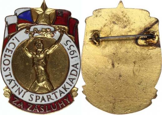 Odznak, "I. Celostátní spartakiáda 1955", nápis v bílém smaltu, uprostřed ve zlatém poli cvičenec, dole v červené stužce nípis ZA ZÁSLUHY smalt. bronz 29x41,5 mm připínací sponka