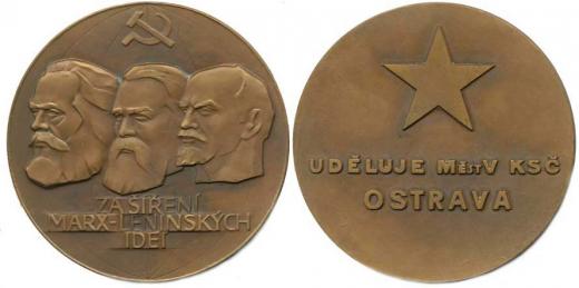 Plaketa "Za šíření Marx-Leninských ideí", portréty Marxe, Engelse a Lenina zleva, nápis / hvězda a nápis UDĚLUJE MěstV KSČ OSTRAVA sign.: J P bronz 80 mm 207,85 g eteu