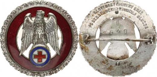Odznak "Slovenský červený kříž" - Po desaťročnej vzornej službe stříbrný 34 mm červený smalt číslovaný /649/ "R"