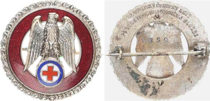 Odznak "Slovenský červený kříž" - Po desaťročnej vzornej službe stříbrný 34 mm červený smalt číslovaný /359/ "R" MJ: 25.1.2