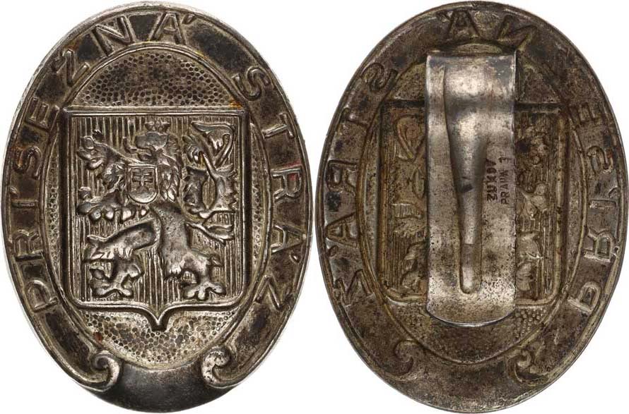 Přísežná stráž (po r.1918) lev na štítě, bez čísla bílý kov 37x49 mm jazýč. úchytka s nápisem ZUKOV Praha 3