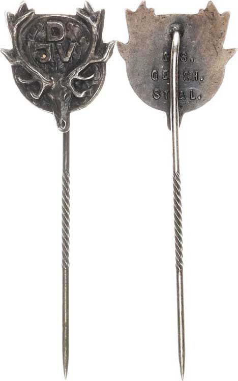 Odznak: "D J V" (Deutscher Jagd Verband) ražebna: GES.GESCH.ST L bílý kov 15x14 mm jehlice