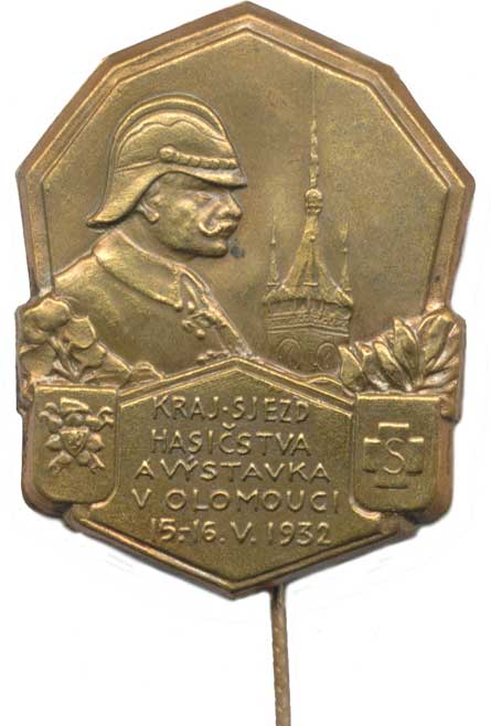 Olomouc - Kraj. sjezd hasičstva a výstavka 15.-16. V. 1932 bronz. plech 29x39 mm_oprav. jehla