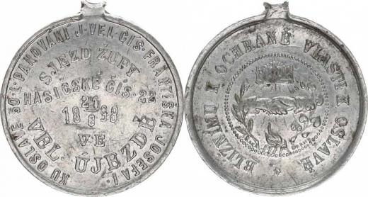 Velký Újezd (okr. Olomouc) - Sjezd źupy hasičské čís. 22; 21.8. 1898, ku oslavě 50. l. panování j. vel. cís. Františka Josefa I., / spojené ruce pod korunou se svatozáři, opis: BLIŽNÍMU K OCHRANĚVLASTI K OSLAVÉ sign.: Šmakal Sn 30 mm_oškoz. ouško
