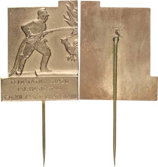 Slovensko - Celoštátný sjazd čsl. hasičstva 3.-6.7. 1937 v Bratis lave raž.: Mincovna Kremnica zlacený bronz 30x38 mm jehla