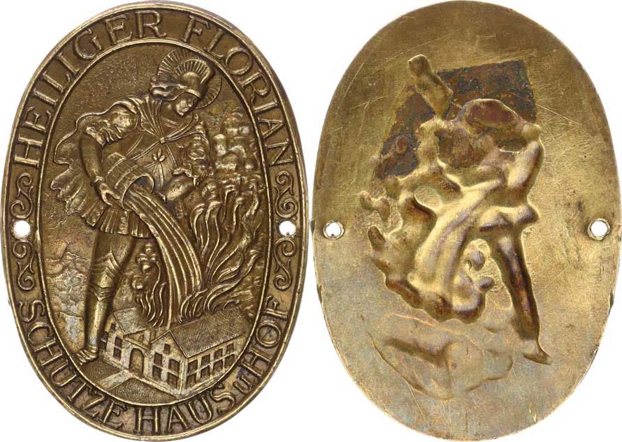 Německo - "HEILIGER FLORIAN - SCH'UTZE HAUS u HOF", sv. Florián h así statek mosaz. ovál 46,5x66,5 mm 31g dvě dírky pro úc hyt