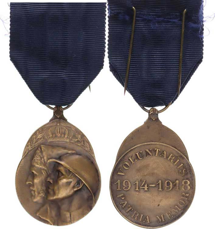 Albert I. (1909-34), "VOLUNTARIS PATRIA MEMOR 1914-1918", medaile vojenských dobrovolníků bronz orig. stuha