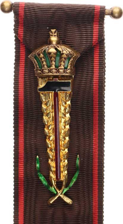 Odznak práce "d´ Honneaur du Travail" - bronzový, bronzová koruna (pro zasloužilé pracovníky za jejich dovednost a oddanost) na stuze s ráhnem