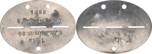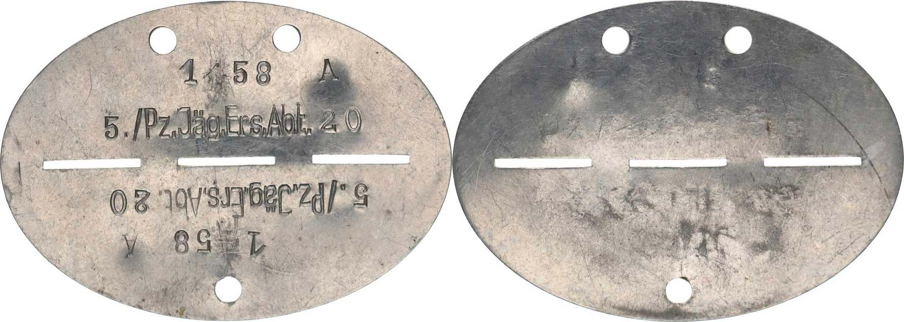 Vojenká identifikačí známka: "5./ Pz. Jäg. Ers. Abt. 20 číslo 1458 A ovál. plech 70x50,5 mm