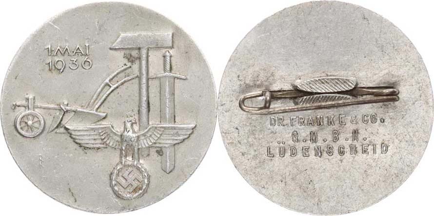 Odznak "1. MAI 1936" ražebna: DR. FRANKE & CO. G.M.B.H. LÜdensch eid Al 35 mm sponka