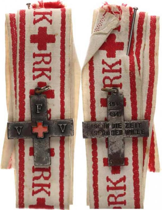 Vlastenecký ženský spolek Červeného kříže 1914-1917; A: v ramenou kříže písmena V F V, uprostřed smalt. červ. kříž / 1914-1917 - EI SEHN DIE ZEIT/EISFRN DER WILLE číslo 6836 +nákrční tkaná stuhaFe 27x27 mm