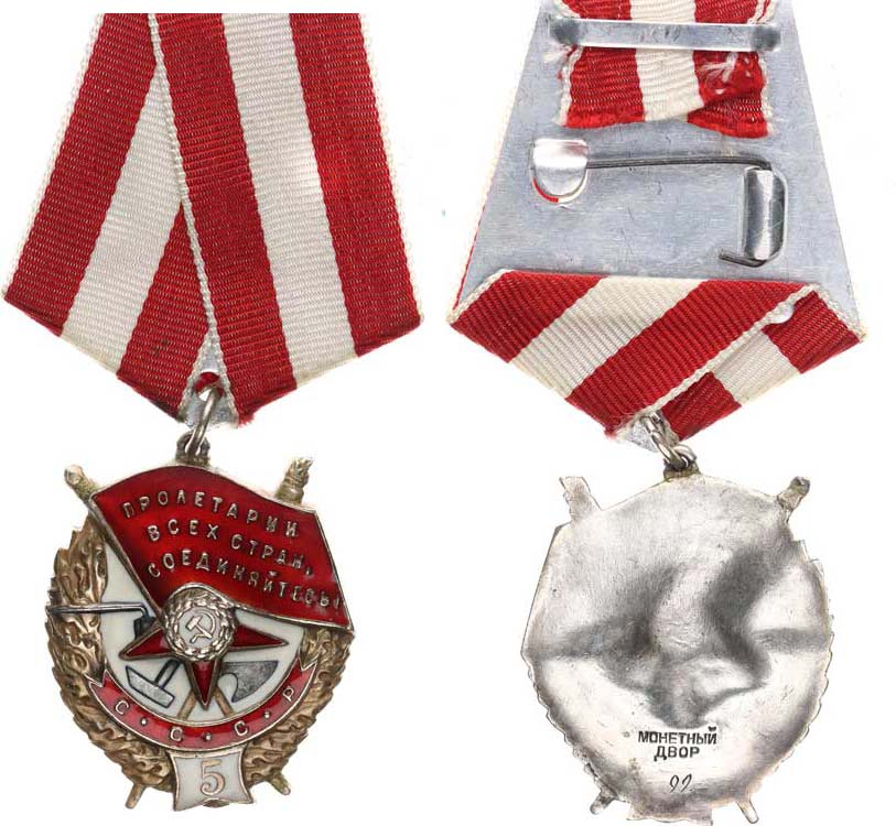 Řád "Rudého praporu práce" 5. udělení, číslo 92 MONETNYJ DVOR (ve dvou řádcích pod sebou) výška 39,4 mm, šířka 35 mm váha 19 g stuha na Al kolodce Herf. 2.14.9; Barac: 945 KOPIE_oprav. ouško