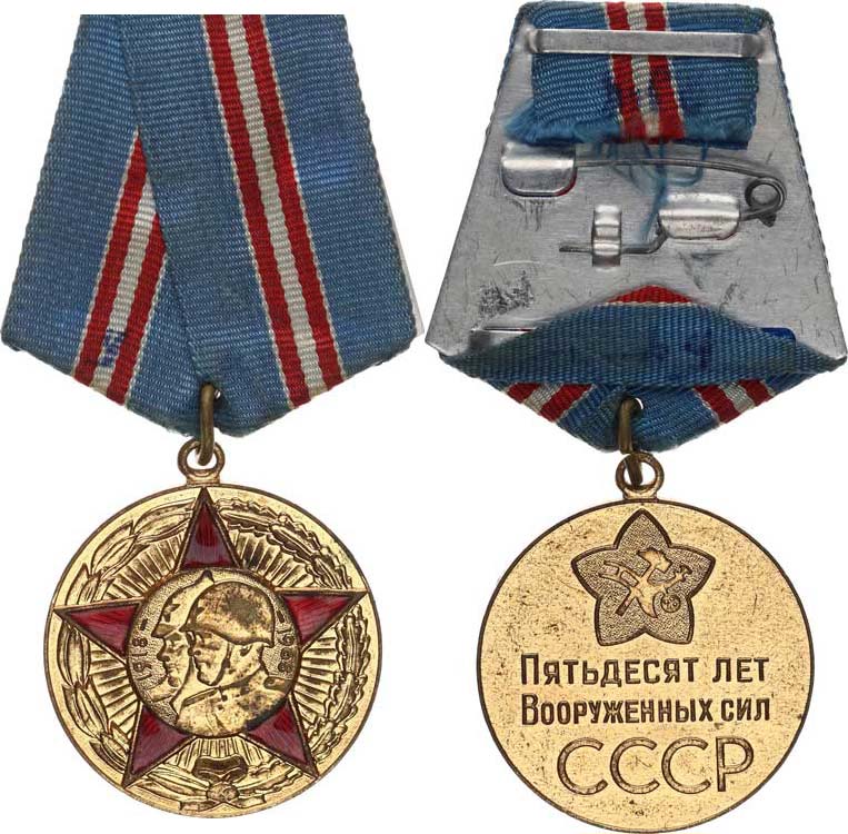 Medaile "50 let ozbrojených sil SSSR" zlatá, ouško zn. LMD stuha na kolodce Her. 3,49