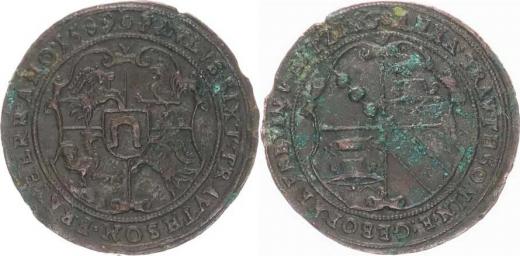 Pamětní fenik (žeton) na sňatek s první manželkou Annou z Eytzing 1589, znak rodu Trautsonu, opis / znak rodu Eytzing, opis Cu 3 0 mm 6,5 g Neum. 28890; Wi. 909; LG.II/1313 "R"_mír. oxyd.