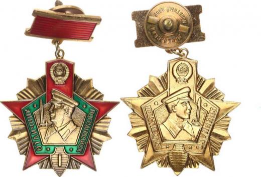 Vojenský odznak "Otličnyj pogranvojsk" více barev. bronz. hvězd a s ouškem a malým červeným kov. štítkem šroub. ůchyt