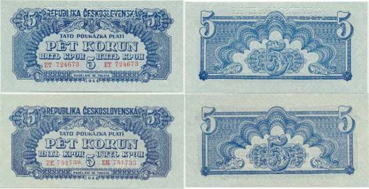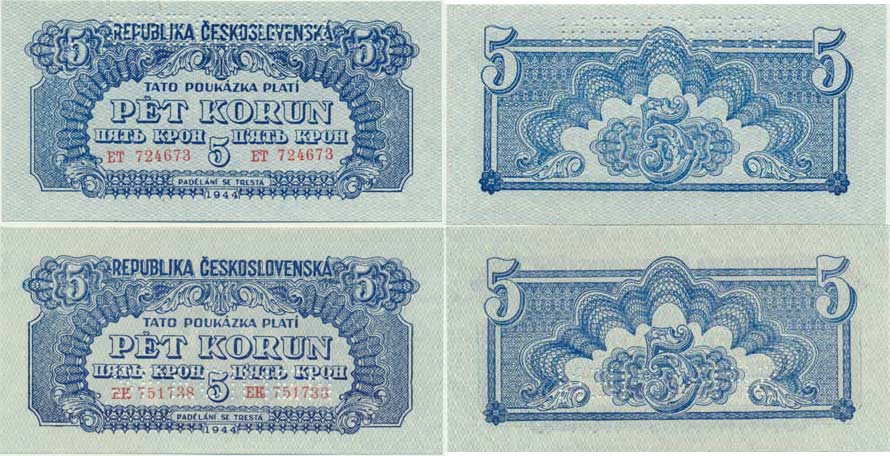 5 K 1944 sér. ET - podtisk vodorovný SPECIMEN - nahoře Hej. 57a S1; Baj. 57a V5 K 1944 sér. EK - podtisk svislý SPECIMEN - dole Hej. 5Baj. 57b S2; Baj. 57 b 2 ks