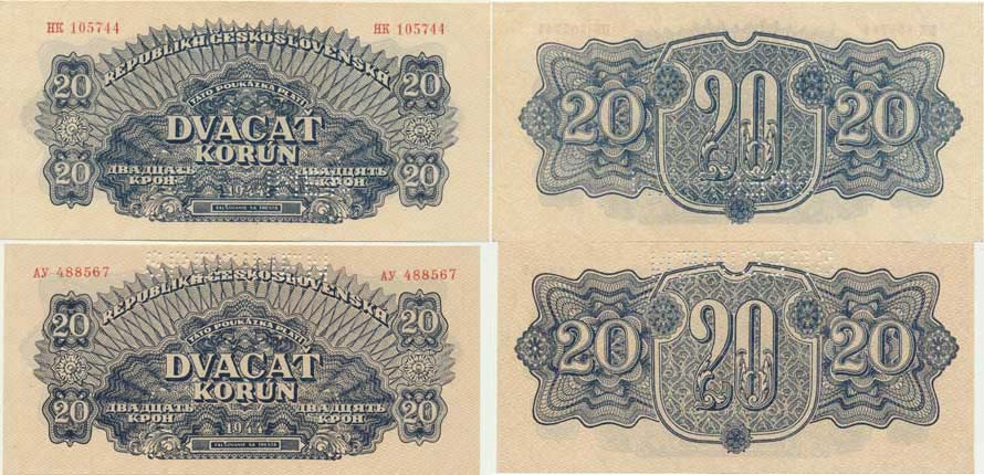20 K 1944 sér. AY 1x SPECIMEN - nahoře Hej. 58a S1 20 K 1944 sér. HK 1x SPECIMEN - dole Hej. 58b S2 Baj. 58a, 58b 2 ks