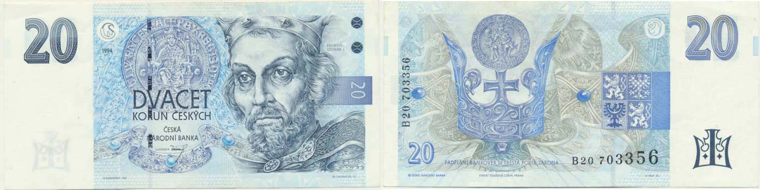 20 Kč 1994 (var. 1996) sér. B 20 - proužek vlevo Hej. CZ 14a; Bajer CZ 10b