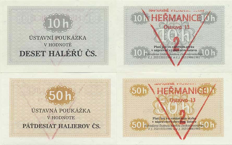 50 Halierov 1981 - ústavná poukážka , razítko: Nápravně výchovný ústav Heřmanice Ostrava 13 (červené trojúhel. ratítko s čísl. 2) +2/ 10 Haléřů 1981 - ústavní poukázka , razítko: Nápravně výchovný ústav Heřmanice Ostrava 13 (červené trojúhel. ratítko s číslem 2) 2 ks