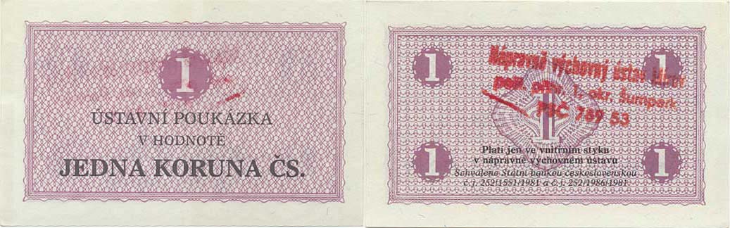 1 Koruna 1981 - ústavní poukázka , razítko: Nápravně výchovný ú stav Mírov pošt. přihr. 1 okr. Šumperk PSČ 78953 (3řádk. nápis č erv. barvy)