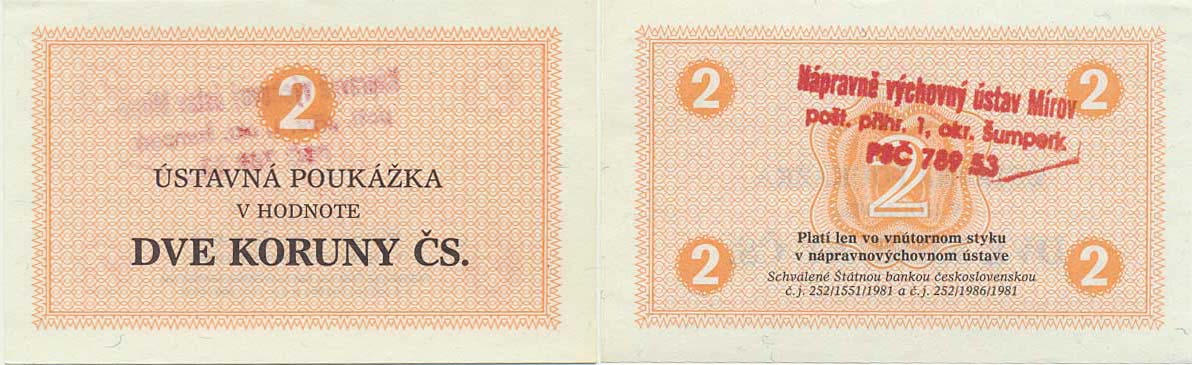 2 Koruny 1981 - ústavná poukážka , razítko: Nápravně výchovný úst av Mírov pošt. přihr. 1 okr. Šumperk PSČ 78953 (3řádk. nápis čer v. barvy)