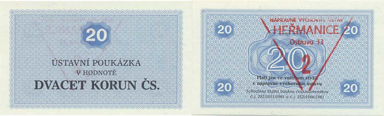 20 Korun 1981 - ústavní poukázka , razítko: Nápravně výchovný úst av Heřmanice Ostrava 13 (červené trojúhel. razítko s čísl. 2)