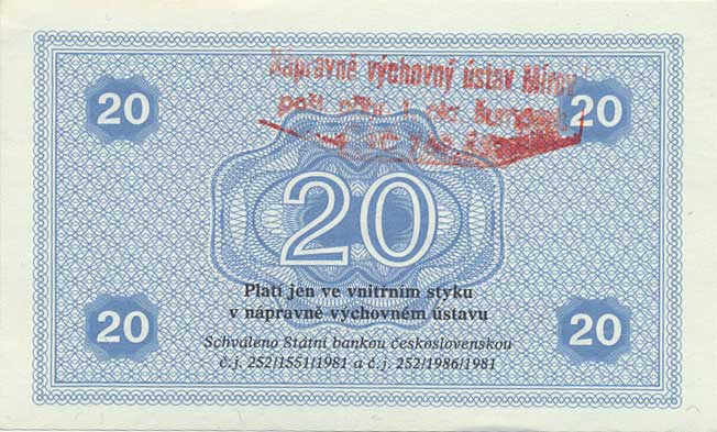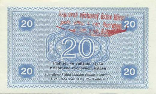 20 Korun 1981 - ústavní poukázka , razítko: Nápravně výchovný úst av Mírov pošt. přihr. 1 okr. Šumperk PSČ 78953 (3řádk. nápis čer v. barvy)