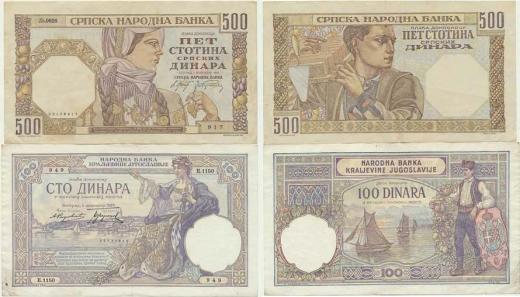 500 Dinara 1.11. 1941 - průsvitka ženská hlava Pick 27b Jugoslávie - 100 Dinara 1.12. 1929 - průsvitka Alexander I. Pick 27b 2 ks