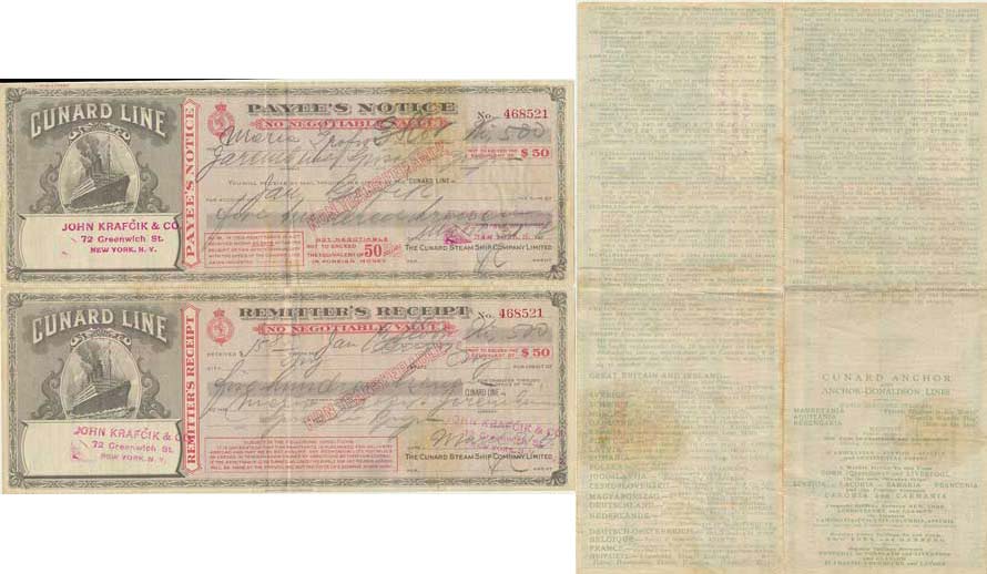 U.S.A. - CUNARD LINE, lodní společnost - dvoudílný šek z r. 1924, oznámení platby a potvrzení příjmu 500 korun (tento šek nesmí pře ekočit ekvivalent částky 50 dolarů)