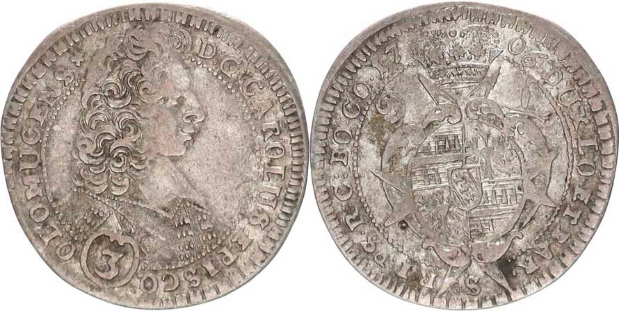 3 kr. 1706 S S-V 542 B4/B3 - var.: před písmenem S p od maltéz. křížem jedna tečka_tém.
