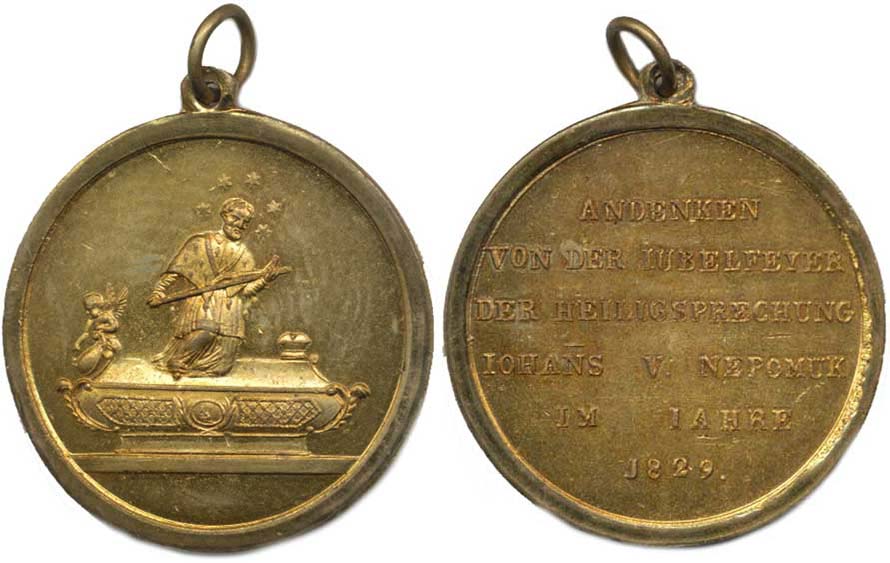 Medaile - Sarkofág sv.Jana Nepomuckého / Památka na jubilejní sva tořečení Jana Nepomuckého v r. 1829, šesti řádkový německý nápis zlacený bronz 43 mm Přib. 579; GR. 69