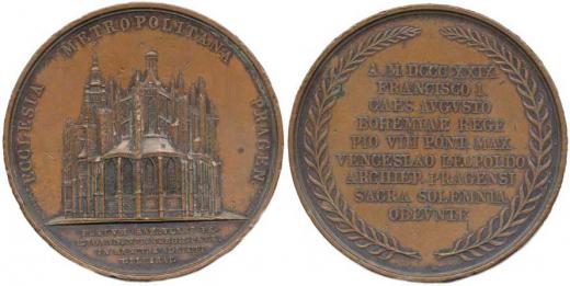 100. výročí svatořečení Jana Nepomuckého 1829. A: Chrám sv. Víta v Praze, opis, 4řádk. nápis / 9ti řádk. latinský nápis v otevřené m věnci sign.: F. PUTINATI Přibil 574 Cu 50 mm 62,60 g (Cu byly určeny profesorům teologie a nižším úředníkům)