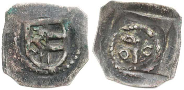 Fenik se čtyřrázem, znak v routovém kruhu / biskupská berla mezi dvěma kroužky v routovém kruhu Rad. VII / 11; Probst 49 0,44 g