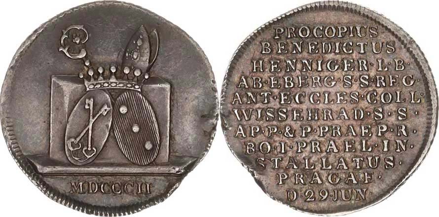 Prokop Benedikt Henniger von Eberg (1801-1809) - Instalační žeton 1802, 11-řádkový nápis / Dva znaky s berlou a mitrou v ex. letopo čet Ag 23 mm 2,218g Don.4698; Přibil 692_vada stř. hr.