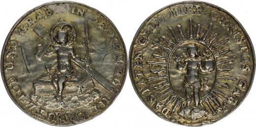 Johann Kittel ? - Sedící Kristus s křížem na náhrobním kameni / S tojící Kristus s královským jablkem, kolem něj gloriola s paprsky a plamínky Ag litá 35 mm 13,088 g_tém.
