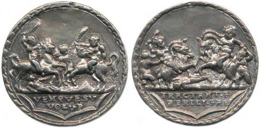 Dva nazí jezdci na koních drží zvednuté kyje a pobíjejí okolní pě ší nahé postavy. VENQVESV / VOLVP / R: dva nazí jezdci sedící na kozorozích bojují s okolními postavami TRACTANT . F / ABRILI .FAB Ag 33,5 mm 14,32 g "RR"