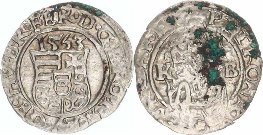 Denár 1563 KB Husz. 936 0,45 g_zelená ox. skvr.