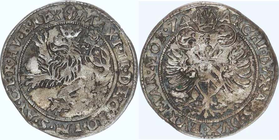 Bílý groš 1574, Jáchymov-Geitzkofler MKČ 238 zn.2 v líci -opis: MAXI. II. DE. G. RO. IM. S. AV. GE. R. HV. B. REX / ... MAR. MOR. 74 1,938 g_zbytky patiny