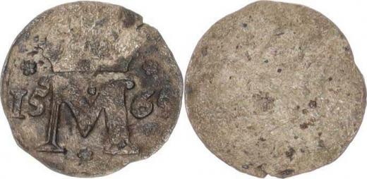 Malý (černý) peníz 1565, K.Hora-Ludvík Karel+Šatný "RR" Hal. 207 0,21 g +starý podložní štítek_patina