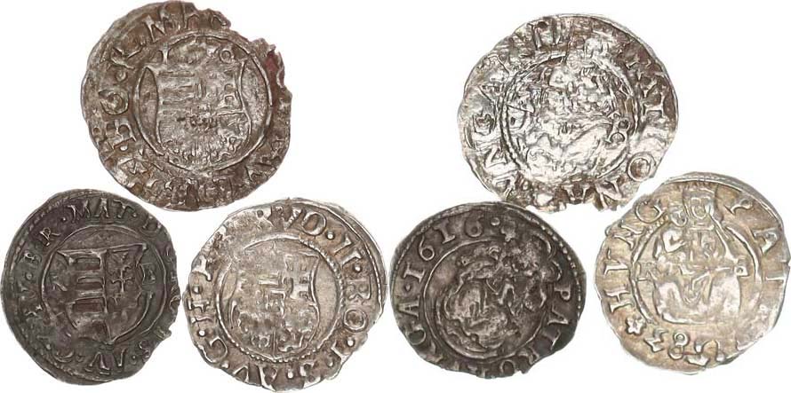 Denár 1576 K-B; +Rudolf II. - Denár 1583 K-B; +Matyáš II. - Denár 1616 K-B 3 ks_neprav. střížek