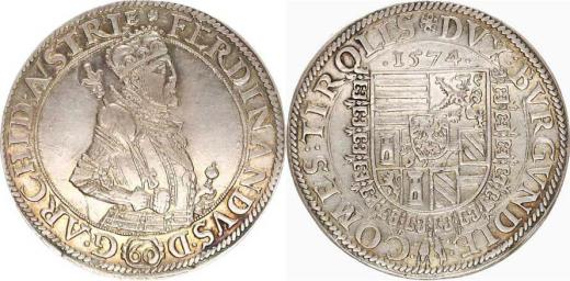 Zlatník (60 kr.) 1574, Tyroly Hall "RR" opis: FERDINANDVS. D () G. ARCHID. A´VSTRIe kytička / DVX: BVRGUNDIE: :COMES:TIROLIS kytička 24,50 g