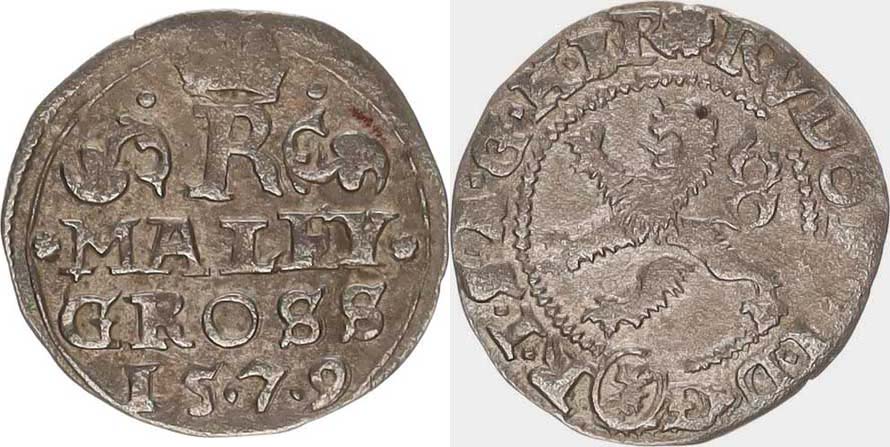 Malý groš 1579, K.Hora-Šatný HN 2b (tečky v dataci 1 5.7.9) schází tečka mezi 1 a 5 "R" 0,77 g