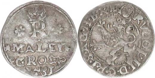 Malý groš 1581, Jáchymov-Kádner HN 3/7b - zajímavě ražená 5 v dataci, před a za MALEY *, před a za GROSS kroužky, nad L kulič ka