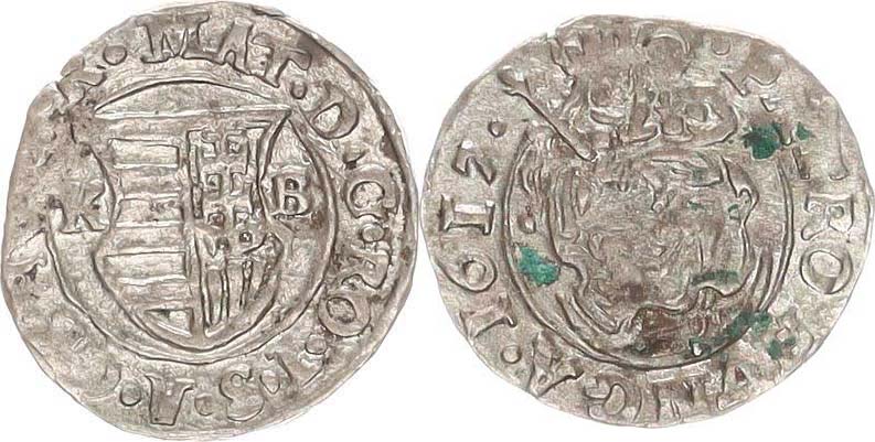 Denár 1617 K-B jako Husz. 1141 opis: I. S. A. GE. ... / teč ka před PATRO 0,50 g_dr. zelené skvr.