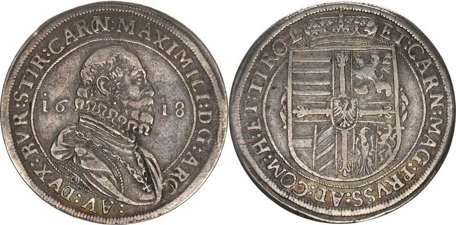 Tolar 1618 CO, Tyroly, Hall Voglh. 122/XIII-XIV poprsí jako XI II, přereažba písm. N v CARN, minc. zn. v závorce nad perlič. kru hem / opis jako XIV, jiné arabesky po straně erbu, koruna jako XIII 28,358 g g/