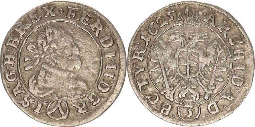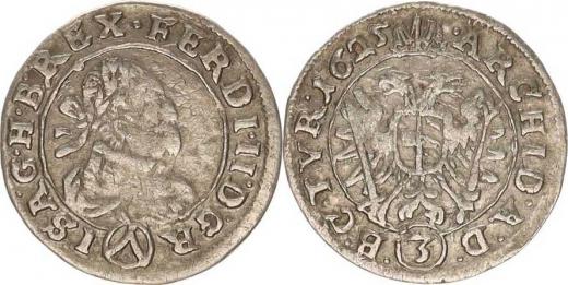 3 kr. 1625, Vídeň-Fellner var.: koruna bez stuh, datace 1625, op is: B.C.TYR. / malá hlava, nepřevyšuje hladký kruh, úzký límec a dlouhá mašle "R"