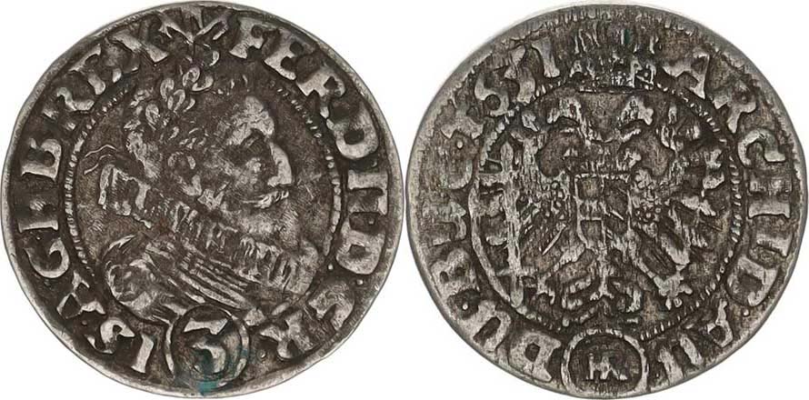 3 kr. 1631 HR, Vratislav-Riedel+Ziesler MKČ 1020 var.: malá mincm. značka 1,639 g