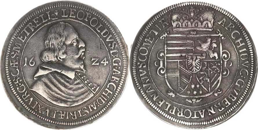 Tolar 1624, Tyroly Hall - v duchovním hávu Voglh. 175/II, ale na Rv. jiné ozdoby kolem erbu, opis končí COME :TIR / nad hlavou kytička "R" 28,521 g "stará patina"