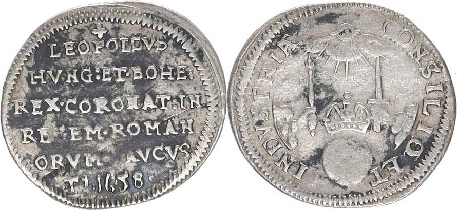 Velký žeton ke korunovaci na římského císaře 1. 8. 1658 ve Frankf urtu, A: 6-řádkový nápis / R: Nahoře nad oblaky je zářící Boží ok o. Po stranách korunov. zeměkoule vystupují z oblak ruce jedna sžezlem a druhá s mečem Ag 24 mm 2,465 g Nov. II/ IX-E 12a; JF 502 "RR"